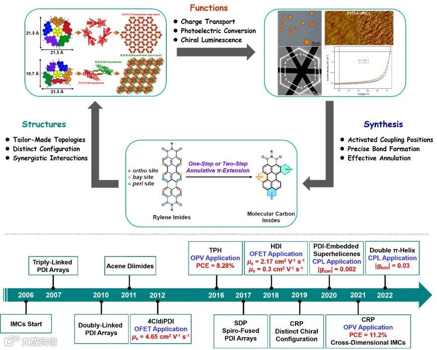 图2. 酰亚胺功能化的分子碳合成-结构-功能关系图及研究团队基于该领域发展的时间轴