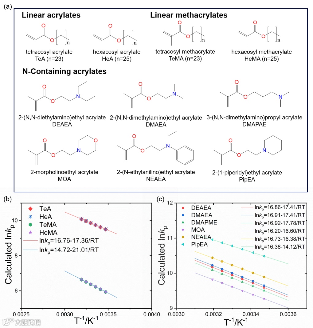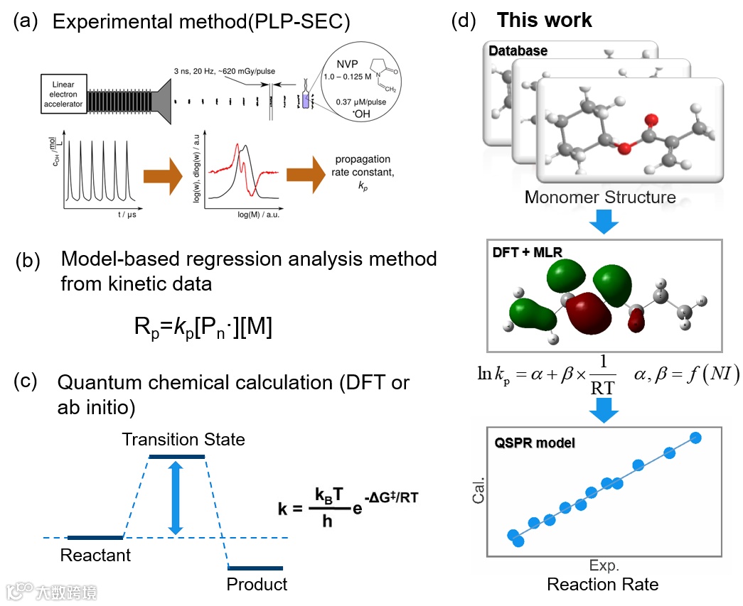 深入了解聚合过程的机理和动力学对聚合物的合成和反应器的控制至关重要。一般来说,这需要精确的速率系数,如增长、终止和链转移速率系数。在自由基聚合(FRP)过程中,单体消耗率和聚合过程的动力学都会受到增长速率系数(kp)的强烈影响。温度依赖的kp是预测全分子量分布(MWD),以及评估聚合物分子的其他性质的重要参数之一。目前常用的确定kp值的方法包括实验测定、动力学模型回归分析和量子化学计算(图1 (a-c))。