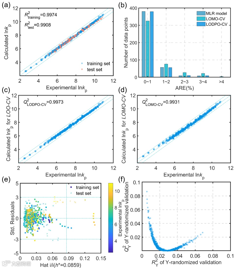 留一法交叉验证(Leave-one-datapoint-out cross validation,leave-one-monomer-out cross validation)检验模型的鲁棒性。测试集结合外部验证参数Q2ext和一致性相关系数(CCC)评价模型的预测能力。通过y随机化检验和应用域分析验证模型的可靠性。模型的检验结果如图3所示,表明模型具有令人满意的鲁棒性、预测能力和可靠性。