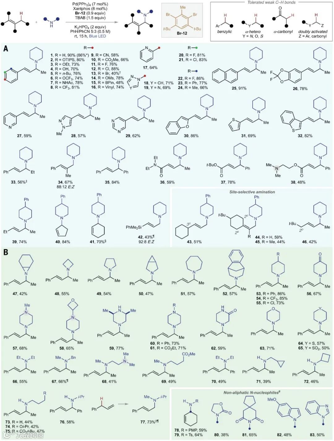 ,例如:苯胺、磺胺、氨基甲酸酯、酰亚胺以及芳香族氮杂环)均是有效的亲核试剂。此外,该方法对于末端烯烃(