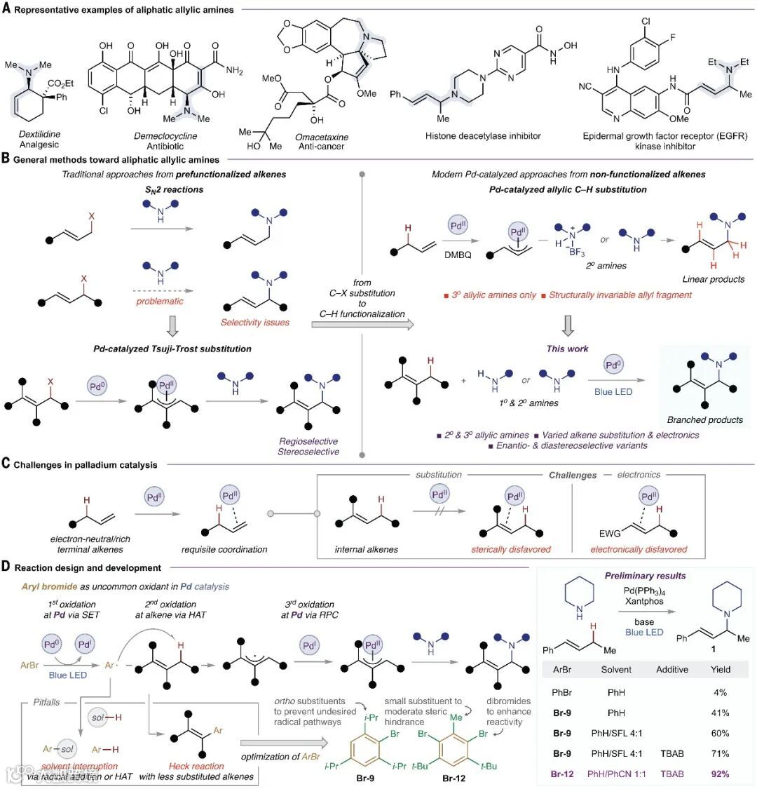 脂肪胺普遍存在于天然产物、药物分子和其它生物活性分子中,其中烯丙基胺是一种特别有吸引力的合成目标(图1A)。近些年来,科学家开发了许多构建脂肪族烯丙基胺的方法,例如:1)预官能团化烯烃的亲核取代反应(图1B,左上),但通常会伴随双烯丙基化等问题;2)Pd催化的Tsuji-Trost反应(图1B,左下);3)钯催化的烯丙基C-H键胺化反应(图1B,右上);4)光催化和电催化的烯丙基C-H键胺化反应。尽管如此,但因选择性、亲核试剂的种类以及烯烃空间位阻等多方面的因素严重阻碍了脂肪族烯丙基胺的构建,尤其是脂肪族伯/仲胺以及医药上有价值的杂环(如:哌啶和哌嗪)作为亲核试剂,因此直接实现不同取代型烯烃的烯丙基胺化反应仍然是一个重大挑战。