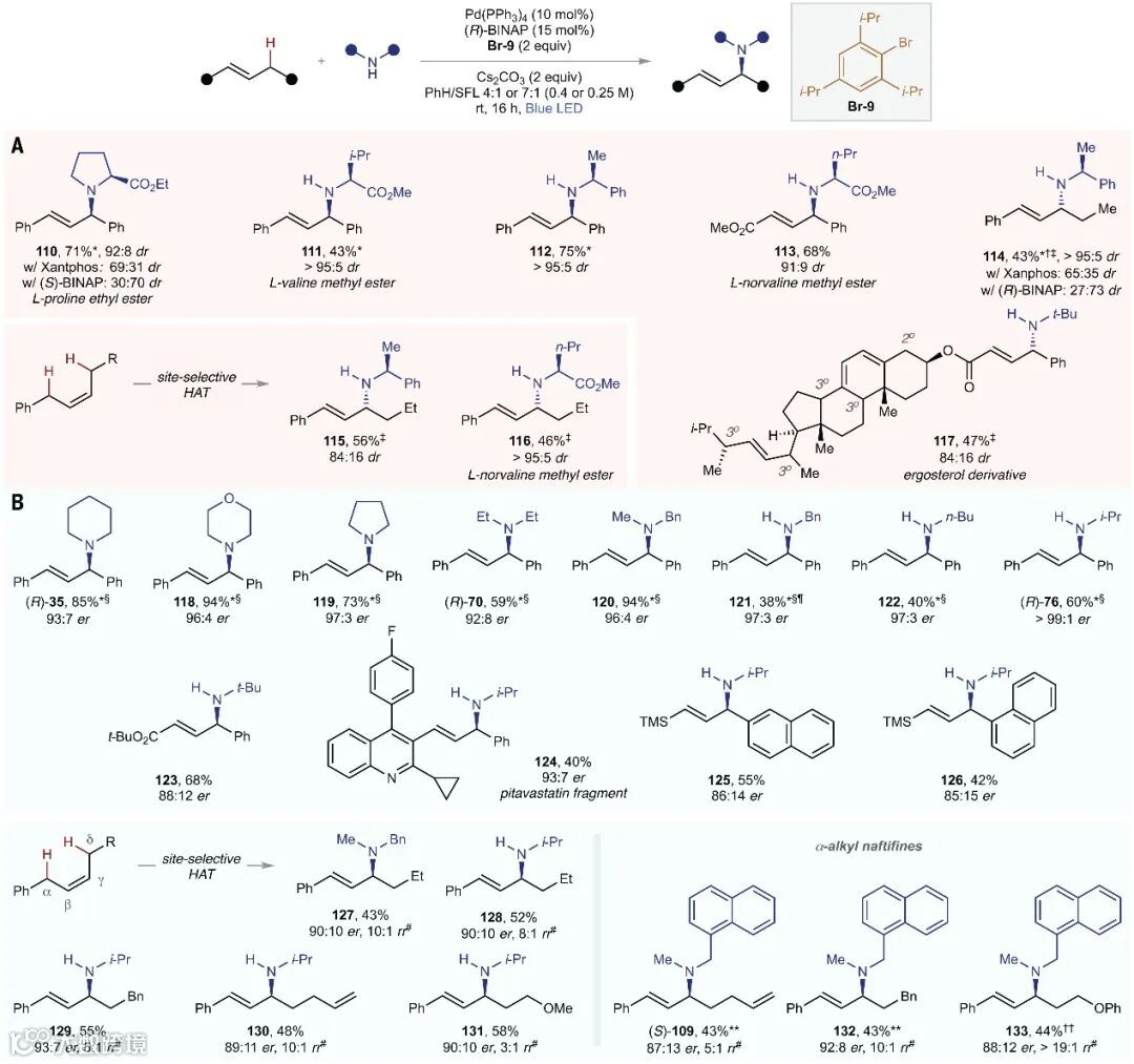 Vladimir Gevorgyan教授课题组在利用光诱导电子转移形成多功能 Pd(I)中间体的策略,开发了一种用于不同取代的烯烃与伯/仲脂肪族胺的分子间烯丙基C-H键胺化的光催化通用平台,还成功地实现了多种烯烃的对映和非对映选择性烯丙基C-H键胺化。该方法不仅条件温和、底物范围广、官能团耐受性好,而且对药物分子、天然产物及其衍生物的合成以及后期修饰均有很好的效果。