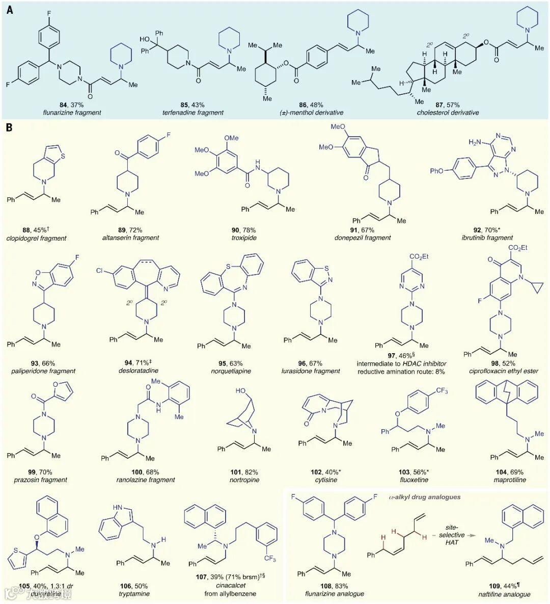)。鉴于哌啶和哌嗪骨架在医药领域具有广泛的应用,因此作者考察了一系列含有哌啶和哌嗪骨架的药物或其片段(