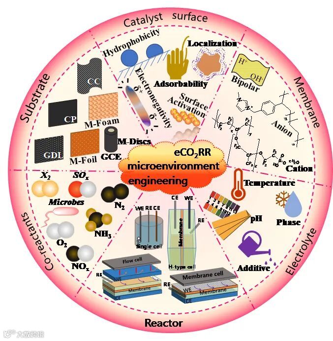 图1. 不同微环境调节 eCO2RR催化性能的方案示意图。