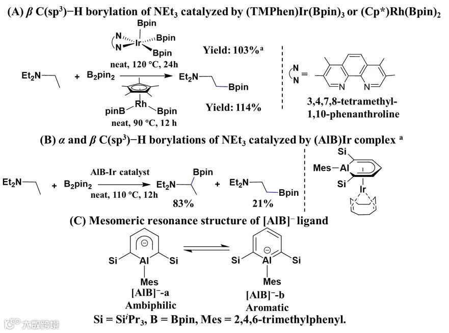 过渡金属催化的惰性C(sp3)−H键官能团化反应为解决有机合成化学中原子经济性的问题提供了新方案。近年来,由于产物可以简便地进行多样性转化,铱催化的C(sp3)−H键硼化受到了越来越多的关注,但因底物存在多个C(sp3)−H键,导致其区域选择性活化仍存在很大的挑战。例如,加州大学伯克利分校的Hartwig教授团队的研究发现含菲罗啉配体的铱配合物或含环戊二烯阴离子配体的铑配合物都可以选择性地使三乙胺的甲基(β)位的C(sp3)−H键硼化(图1A)[1];另一方面,名古屋大学的Yamashita教授团队则发现利用他们开发的铝苯配体,可以使三乙胺亚甲基(α)位的C(sp3)−H键硼化,且产率约为β位的四倍(图1B)[2]。有意思的是:尽管含铝苯配体的铱配合物可以使三乙胺α位C(sp3)−H键选择性硼化,但其对应的铑配合物却没有催化活性。与之形成鲜明对比的是:含环戊二烯阴离子配体的铑配合物可以使三乙胺β位C(sp3)−H键选择性硼化,但其对应的铱配合物却没有催化活性。这些研究结果说明:辅助配体与中心金属的搭配显著影响催化剂的活性及催化剂控制的区域选择性。但是其内在的控制因素与机制却未知,一定程度地限制了后续研究;同时,由于中间体结构复杂多变,使得相关反应机理研究存在很大的挑战性。