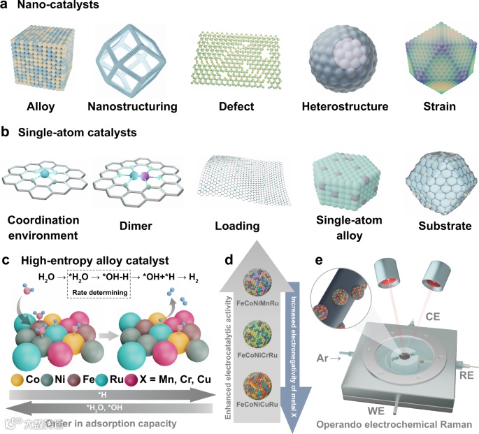 纳米催化剂、SACs和HEA催化剂设计概念图示