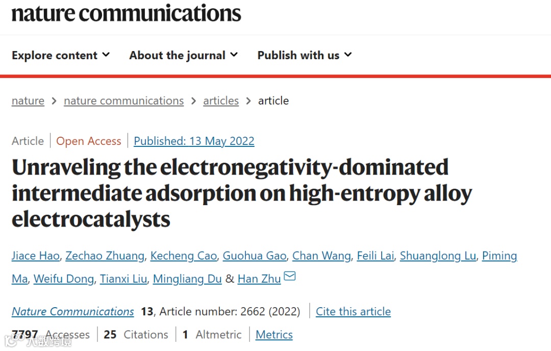 江南大学化工学院杜明亮教授团队在新型能源转化关键催化材料的开发设计与应用方面取得突破性进展,课题组2017级高分子材料与工程专业本科生郝嘉策同学以第一作者在Nature Communications上发表重要学术论文:“Unraveling the electronegativity-dominated intermediate adsorption on high-entropy alloy electrocatalysts(Nature Communications, 2022, 13, 2662)”,通讯作者为朱罕副研究员。该工作为郝嘉策同学本科期间的研究成果,目前郝嘉策同学已经保送江南大学攻读硕士学位。