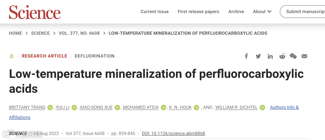 美国西北大学William R. Dichtel、加利福尼亚大学洛杉矶分校K. N. Houk院士及中国科学院上海有机化学研究所薛小松等多团队合作,在 Science 在线发表题为“Low-temperature mineralization of perfluorocarboxylic acids”的研究论文,该研究发现全氟烷基羧酸 (PFCA) 可以通过氢氧化钠介导的脱氟途径进行矿化。
