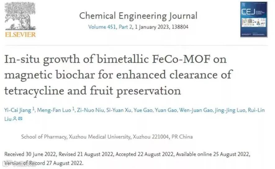 徐州医科大学本科生团队在化学工程领域国际顶级期刊《Chemical Engineering Journal》(中科院一区TOP期刊,IF 16.744)上发表了题为“In-situ growth of bimetallic FeCo-MOF on magnetic biochar for enhanced clearance of tetracycline and fruit preservation”的最新研究成果。