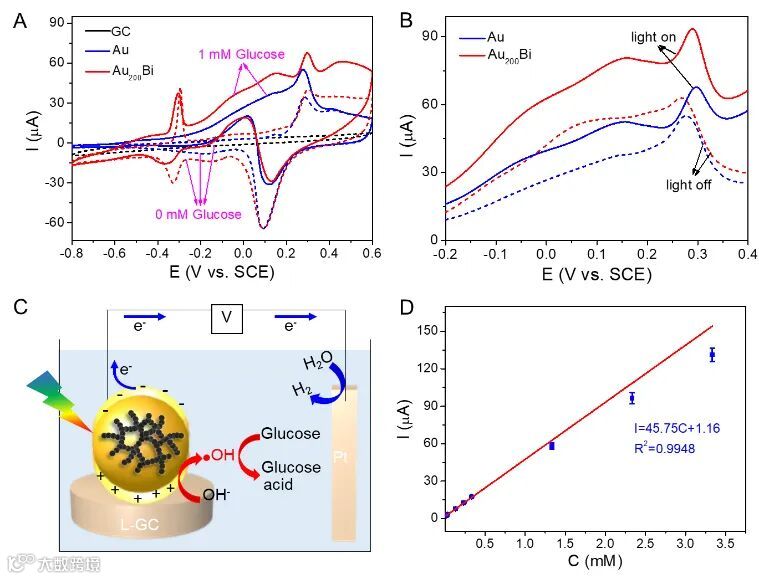 图3.(A)黑暗条件下Au200Bi及Au气凝胶对葡萄糖氧化的电流响应。(B)等离子体激发下Au200Bi及Au气凝胶对葡萄糖氧化的电流响应。(C)等离子体激发下Au200Bi气凝胶检测葡萄糖的机理示意图。(D)等离子体激发下电流与葡萄糖浓度的标准曲线。