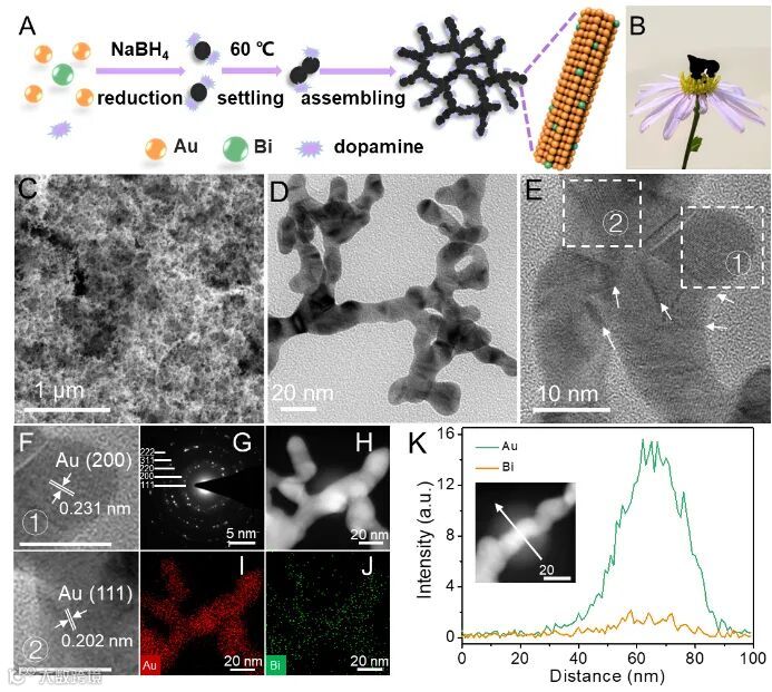 图2.(A)Au200Bi水凝胶的合成示意图。(B)Au200Bi气凝胶的数码照片。Au200Bi气凝胶的(C)SEM,(D)TEM,(E)HRTEM,(F)放大的HRTEM图,(G)SAED,(H)HAADF-STEM和相应的元素分布。(I和J)Au200Bi气凝胶对应的EDX映射图。(K)Au200Bi气凝胶的EDX线扫图。