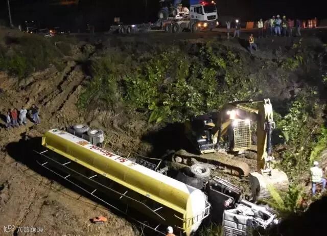 来到现场,眼前的景象让大家倒吸一口冷气,一辆装载1.1万升柴油的油罐车侧翻在15米深的山坳里。
