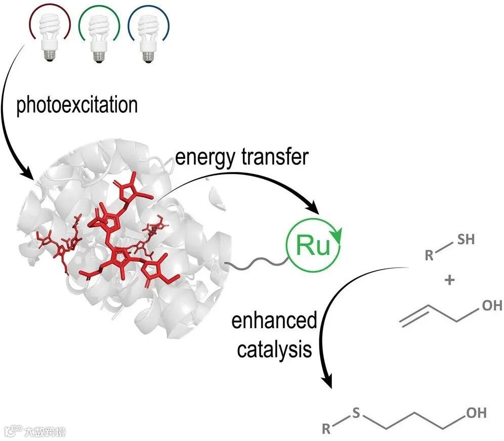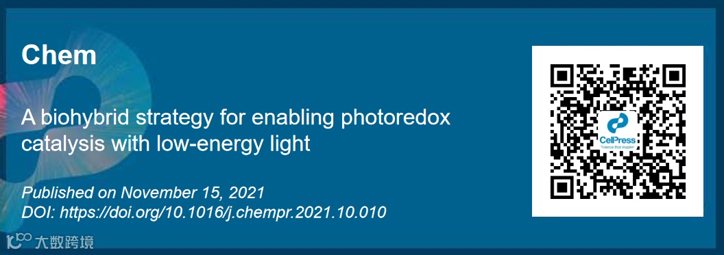 自然界中的光合作用系统能够通过高效和广谱的能量捕获来驱动光合作用的高能反应。过渡金属光催化剂同样能够将光能转化为化学能,但由于需要蓝光至紫外光的激发而受到了一定的限制。在光合作用中,通过分散成不同的活性位点,光捕获和后续反应都可以得到优化。受这种模块化结构的启发,麻省理工学院化学系Gabriela S. Schlau-Cohen团队通过将捕光色素蛋白 R-藻红蛋白(RPE) 共价连接到过渡金属光催化剂[Ru(bpy)3]2+上,成功合成了一种生物杂化光催化剂。光谱研究发现,该催化剂吸收的光能可以有效地从RPE转移到[Ru(bpy)3]2+。实验结果表明,使用该生物杂化光催化剂催化的硫醇-烯偶联反应和半胱氨酰-脱硫反应的产率得到了提高,且该催化剂能够在[Ru(bpy)3]2+单独不吸收的红色波段体现反应活性,以上结果都有效证明了该催化剂的催化作用。