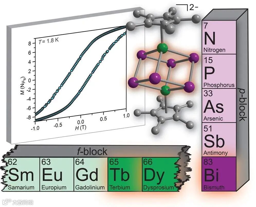 单分子磁体 (SMM) 是一类在没有外加磁场的情况下仍能保持磁极化的分子,这类分子是基于分子自旋且能够用于信息存储和处理的最小尺度单元。传统的多金属镧系元素配合物由于缺乏磁交换耦合而表现出快速弛豫过程,这在一定程度上限制了这类化合物的应用潜力,而引入具有扩散轨道的抗磁性重主族元素有可能会引起罕见的强耦合。基于这一思路,密歇根州立大学化学系Selvan Demir课题组通过溶液法合成了两个铋簇桥连的镧系元素配合物 [K(THF)4]2[Cp*2Ln2Bi6] (Cp* = 五甲基环戊二烯基;1-Ln, Ln=Tb,Dy)。中性的 [Ln2Bi6] 异金属立方烷结构构成具有镧系元素中心,中心间通过罕见的 Bi66-Zintl津特耳离子桥接,这种结构能够实现镧系元素之间的强铁磁相互作用。这为仅包含镧系元素离子的化合物形成超强磁交换耦合SMM创造了条件,并能够观察到罕见的磁阻曲线和磁滞回线。该配位化合物的成功合成实现了第一个含有铋供体的SMM的构建,有望为实现相关的量子计算相关的合成目标铺平了道路。
