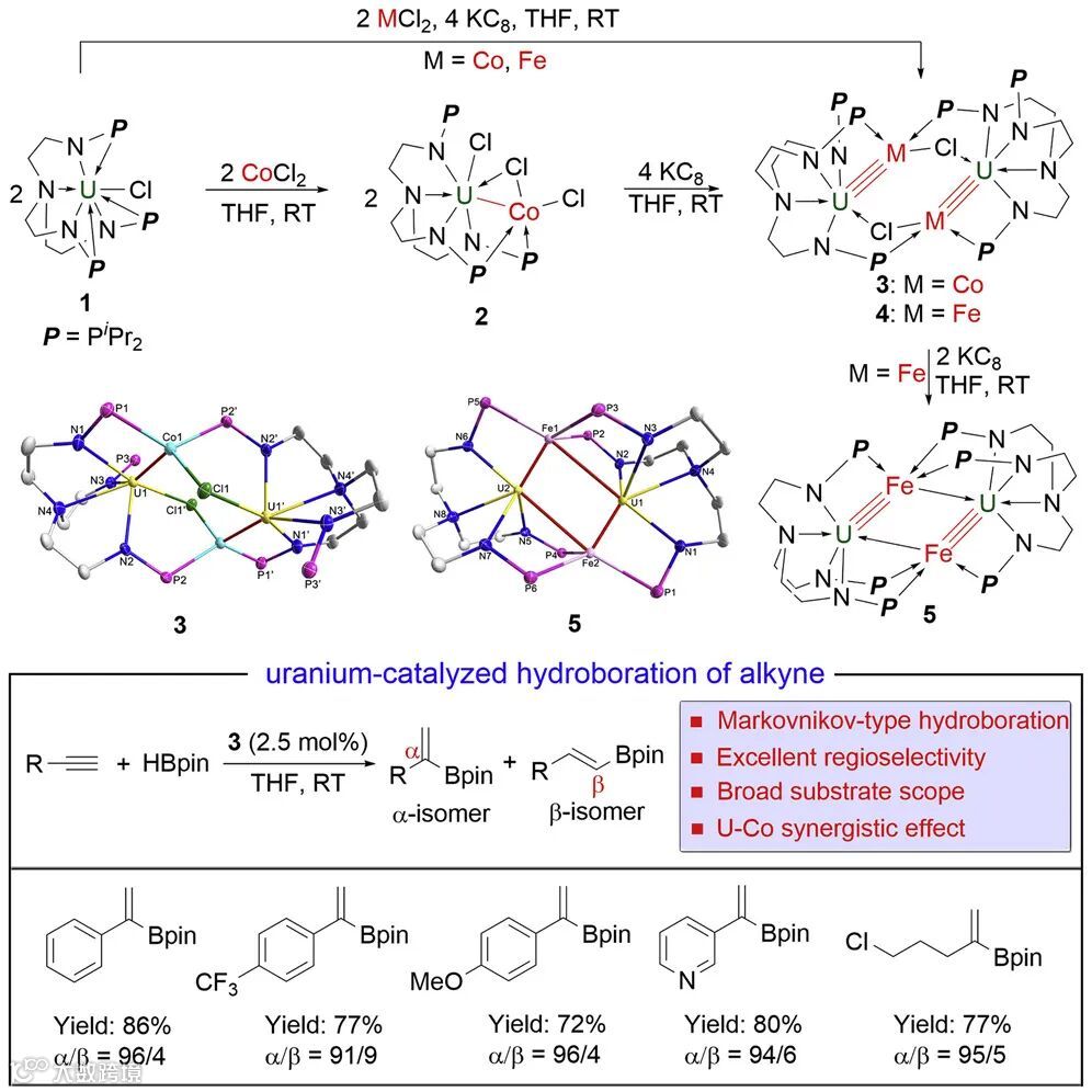 具有金属-金属(M-M)键的异金属团簇由于其独特的结构和催化协同效应,几十年来一直吸引着化学家们的兴趣。然而,与d区过渡金属相比,对f区元素M-M键的化学性质的了解明显落后,而且迄今为止还没有实现利用具有U-M键的异金属簇的催化反应。南京大学化学化工学院,配位化学国家重点实验室,江苏省先进有机材料重点实验室朱从青教授与法国图卢兹第三大学纳米物体物理与化学实验室 (LPCNO) Laurent Maron教授及其同事报告了一组特征为U≡M (M=Fe, Co)三键的异金属簇合物。具有两个U≡Co三键的簇合物在温和条件下对炔烃的硼氢化反应表现出良好的催化活性,生成的α-乙烯基硼酸酯具有良好的产率和区域选择性。这些异金属团簇代表了f区元素和过渡金属之间的多重键合的罕见的结构验证的例子。理论研究揭示了这些U≡M三键的高键序(高达2.93)和显著的共价程度。