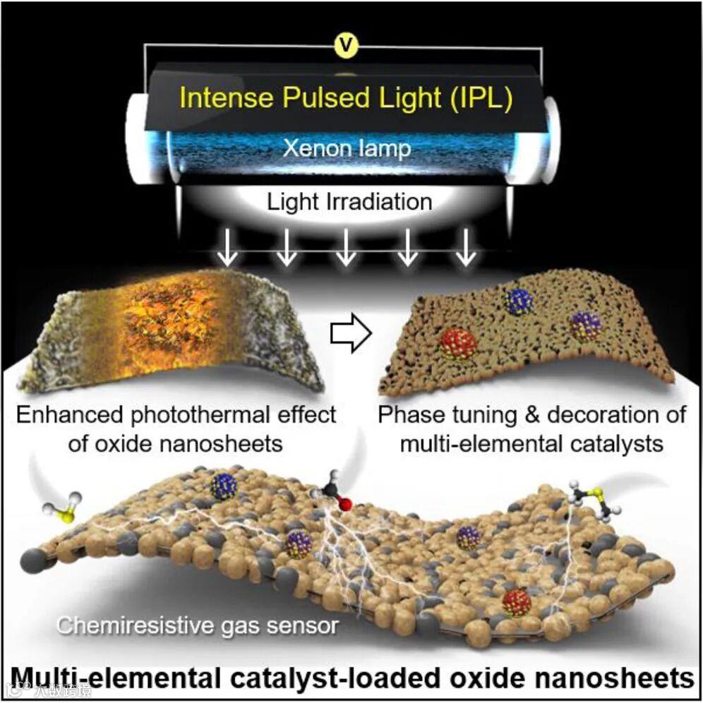 基于光激发电子在材料中产生的瞬间热退火技术已被应用于碳、金属和窄带隙黑色氧化物的超快光学烧结。然而,由于白色氧化物的光热转换效率较低,激活白色氧化物的光热效应是一个巨大的挑战。最近,韩国科学技术院材料科学与工程系Il-Doo Kim教授及其同事报道了通过闪热冲击(FTS)照明对二元白色氧化锡(SnO2)的显著增强的光热效应,这是由具有丰富缺陷的多晶纳米片的低热导率触发的。这些特性使SnO2在环境空气中进行瞬间高温退火(温度:1800°C,持续时间:20 ms)成为可能。重要的是,FTS过程促进了SnO2整体晶格晶体结构的热化学调谐,以及在锡氧化物基体上同时超快合成多元素纳米颗粒(10 nm)和/或单原子催化剂。为了证明它们的实际用途,研究人员展示了微机电系统卓越的化学电阻气敏能力。
