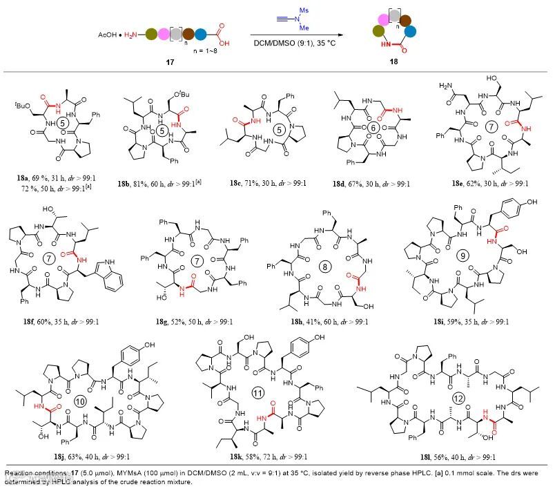 为了进一步考察炔酰胺缩合剂在首尾环肽合成中的适用性,作者制备出一系列含不同数目(5-12个)氨基酸的直链肽,这些直链肽在炔酰胺缩合剂的作用下均以较好的收率获得目标环肽,其中包括Stylostatin 1、Phakellistatin 13、Mahafacyclin B、Dichotomin G、Phakellistatin 12、Stelladelin D等生物活性环肽。炔酰胺介导的直链肽首尾环化策略展现出了广谱的关环位点范围,并且对羟基、伯酰胺、吲哚等活泼侧链官能团具有很好的兼容性,间接缓解了直链肽环化过程中溶解性差的问题。更重要的是,这些直链肽在首尾环化的过程中连接位点都没有发生α-位手性中心外消旋化,而且还能够用于较大量的环肽合成。这些实验结果充分证明炔酰胺缩合剂可以作为一种操作简单、连接位点广谱且不诱发差向异构化的缩合剂用于多肽首尾环化。