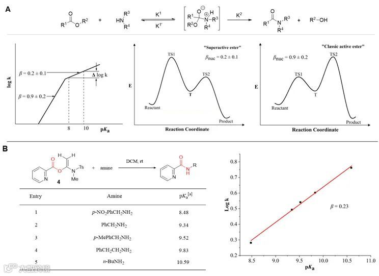 首先,作者对炔酰胺介导的“两步一锅法”肽键形成进行了动力学研究。其结果表明,在羧基活化过程中,α-酰氧基烯酰胺活化酯的生成速率与炔酰胺呈现零级反应关系,而与羧酸呈现一级反应关系;在接下来的活化酯氨解过程中,酰胺键的形成速率与活化酯和胺均呈现一级反应关系,为改善反应速率提供了理论指导。为进一步剖析氨解过程,作者进行了胺的碱性与反应活性关系的研究,来确定氨解反应的决速步。其结果表明,在α-酰氧基烯酰胺活化酯氨解反应过程中,四面体中间体的形成是氨解反应的决速步,这与经典活化酯氨解反应中四面体中间体崩塌的决速步完全不同。
