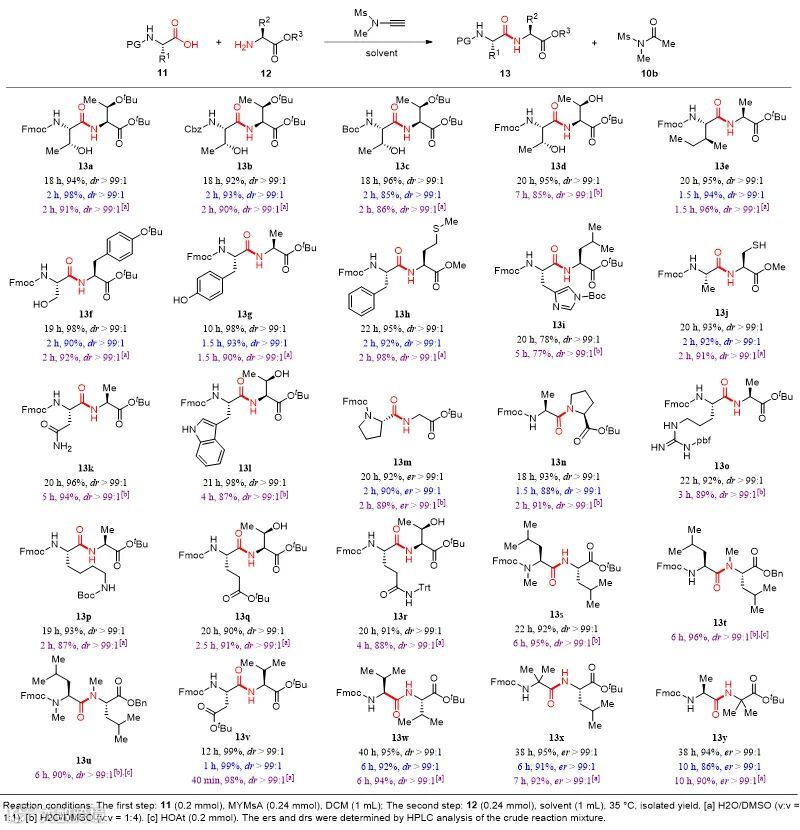 然后,在水相反应条件下,作者对炔酰胺介导的肽键形成策略进行了底物适用性研究。实验结果表明,以水或水和DMSO混合溶液作为溶剂时,20种天然α-氨基酸作为羧酸组分或氨基组分都可以几乎定量的收率得到目标二肽,且与DCM作为溶剂时相比,反应速率得到大幅提高。同时,该反应策略具有极好的酰胺化选择性,使得α-氨基酸含有的羟基、巯基、伯酰胺、吲哚等活泼侧链官能团和Fmoc、Boc、Cbz等氨基保护基具有很好的兼容性。值得说明的是,α-手性氨基酸在该条件下构建肽键的过程中,仍然可以很好的避免α-位手性中心外消旋化副反应的发生。对于一些具有较大位阻的氨基酸,适当延长反应时间同样可以优秀的收率得到目标二肽。除了20种天然α-氨基酸和一些具有较大位阻的非天然氨基酸外,作者还尝试将这种肽键构建策略用于更具挑战性的N-甲基氨基酸。有趣的是无论N-甲基氨基酸作为羧酸组分还是氨基组分,甚至同时作为羧酸和氨基组分,都能以很好的收率得到目标二肽,并且不会发生α-位手性中心外消旋化。最后,作者还成功实现了以组氨酸作为羧酸组分的二肽合成,而这类二肽的合成使用传统缩合剂是比较难实现的。
