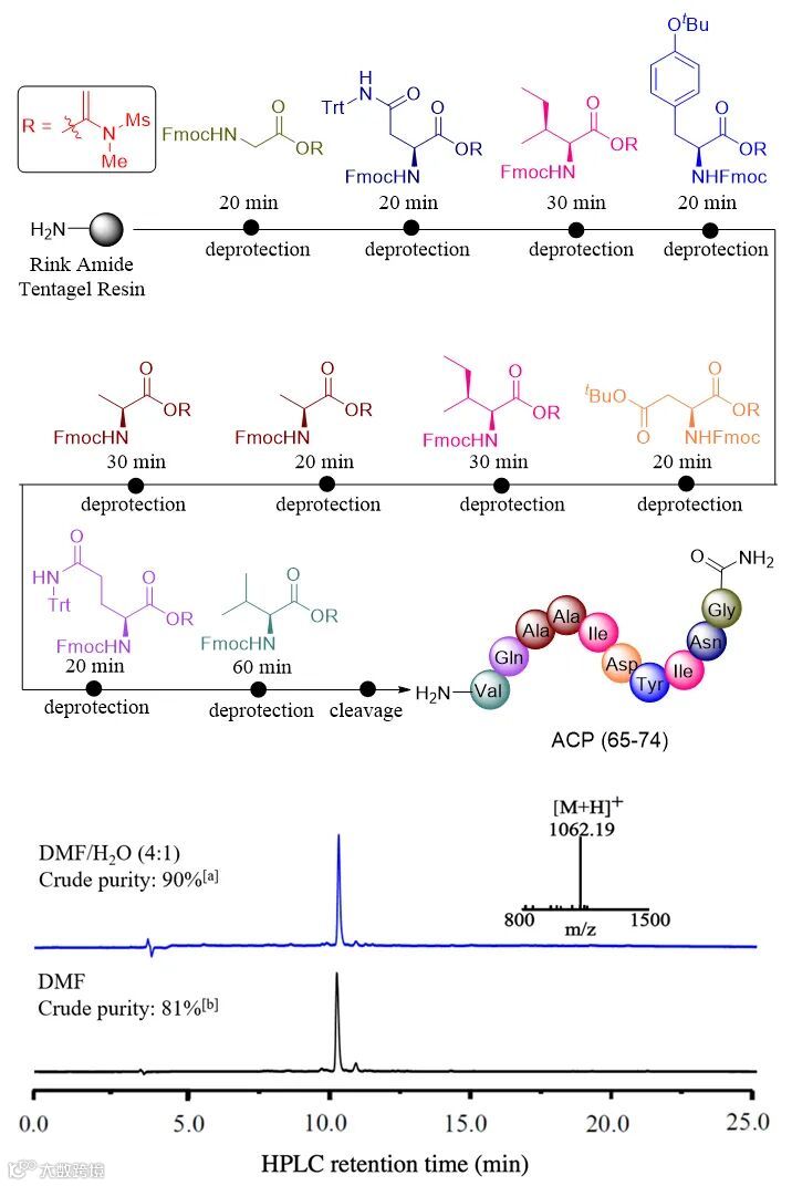作者在前期的研究中已知,各种天然氨基酸和非天然氨基酸都可以很容易地与炔酰胺反应生成α-酰氧基烯酰胺活化酯,这些α-酰氧基烯酰胺活化酯有较好的稳定性,在冰箱中至少可保存6个月而不发生变质。遗憾的是α-酰氧基烯酰胺活化酯的氨解反应速率低、耗时长,不利于固相多肽合成(SPPS)。在本研究中作者发现水的存在能大幅提高α-酰氧基烯酰胺活化酯的氨解反应速率,因此作者尝试发展以含水溶剂为介质的固相多肽合成,探索α-酰氧基烯酰胺活化酯在固相多肽合成中的应用。以在水中可溶胀的树脂为载体,通过条件优化,当以水和DMF混合物(4:1)为溶剂时,氨基酸α-酰氧基烯酰胺活化酯在固相树脂上的氨解反应时间显著缩短至20-30分钟,这一改进使该方法能够与传统的固相多肽合成相竞争。接下来,作者选取经典的困难十肽ACP(65-74)为模型,探索α-酰氧基烯酰胺活化酯在固相多肽合成中的效率。实验结果显示,在最优反应条件下,固相树脂上的每一步缩合反应都能在30分钟内完成,即便是具有挑战性的最后一个缬氨酸,也可以通过适当延长反应时间成功连接上。使用这种合成策略,作者最终获得纯度为90%的困难十肽ACP(65-74)粗产物。这一研究结果表明α-酰氧基烯酰胺活化酯完全可以作为砌块用于固相多肽合成。
