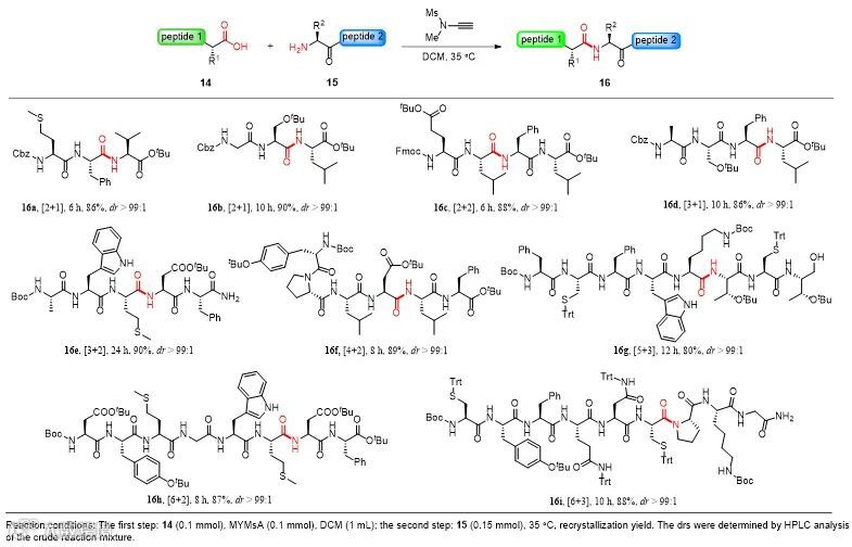 由于多肽片段连接涉及多肽片段羧酸的活化与氨解,而与脲烷型保护基保护的单个氨基酸相比,多肽片段羧酸的活化与氨解更容易发生α-位手性中心外消旋化,所以缩合剂介导的多肽片段连接比简单二肽合成更具挑战性。为了充分展示炔酰胺缩合剂不诱发外消旋化的优势,作者尝试将炔酰胺缩合剂用于多肽片段连接。采用“两步一锅法”肽键构建策略,作者首先尝试了相对简单的[2+1]和[2+2]多肽片段连接,均以优良的收率得到目标肽链,并且没有α-位手性中心外消旋化,证明炔酰胺缩合剂用于多肽片段连接是可行的。接下来,作者将这一合成策略扩展到[3+1]、[3+2]、[4+2]、[5+3]、[6+2]和[6+3]等长链多肽片段连接,五肽胃泌素、奥曲肽、加压素等多肽药物及其类似物等均可通过该策略以很好的收率获得,连接效率不受氨基酸连接位点的影响。更重要的是,炔酰胺缩合剂介导的多肽片段连接均没有消旋化(差向异构化)副反应发生,这一策略无疑为长链多肽的合成提供了一种极富吸引力的方法。