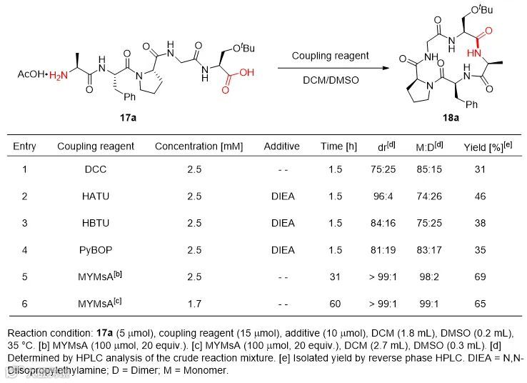 环肽由于其独特的刚性结构和透膜性在药物研发领域表现出显著的优势,受到科学家的广泛关注,各种环肽合成方法被相继报道,其中缩合试剂介导的直链肽首尾环化是一种最直接有效的环肽合成策略。然而,传统缩合试剂介导的首尾环化往往存在二聚或多聚、关环位点α-位手性中心外消旋化等问题。考虑到炔酰胺缩合剂在肽键形成中不消旋的优势,作者尝试将炔酰胺缩合剂应用于直链肽的首尾环化。通过条件优化,作者成功实现了炔酰胺介导的直链肽首尾环化。以直链五肽为模型,他们比较了炔酰胺缩合剂与传统缩合剂在首尾环化中的效果。当使用DCC、HATU、HBTU、PyBOP等传统缩合剂时,有显著的环二聚、差向异构化等副产物生成。相比之下,炔酰胺缩合剂可以避免差向异构化副产物的生成,并且只观察到微量的环二聚体副产物,当作者进一步降低反应物浓度时,基本可完全避免环二聚副反应的发生。