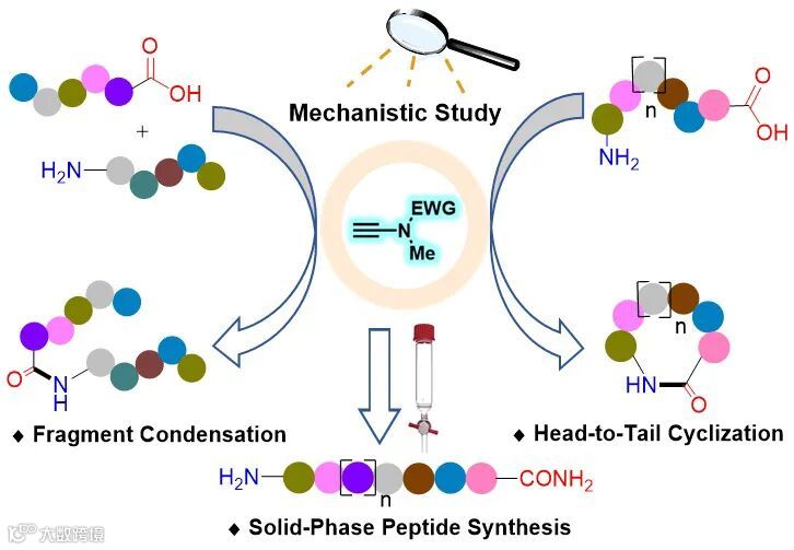 导读:广州医科大学赵军锋课题组成功将炔酰胺介导的无外消旋化的肽键形成从简单的二肽合成延展至多肽片段连接、直链肽首尾环化及固相多肽合成,实现了炔酰胺缩合剂在多肽合成领域应用的全覆盖。