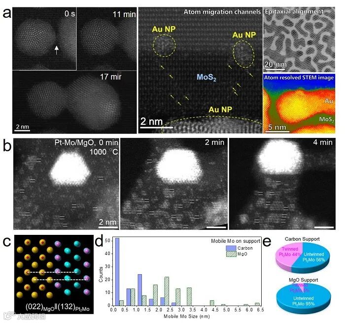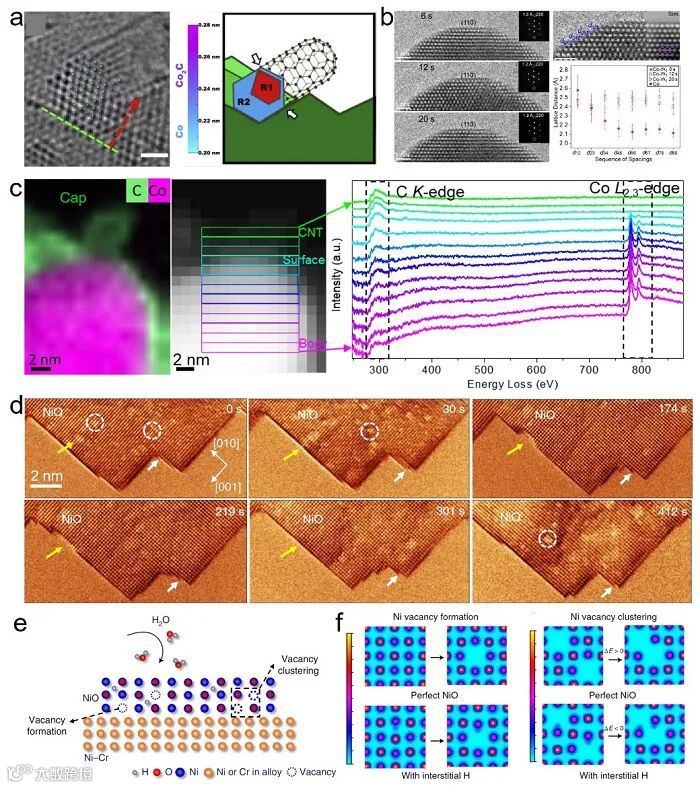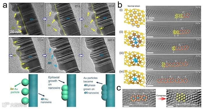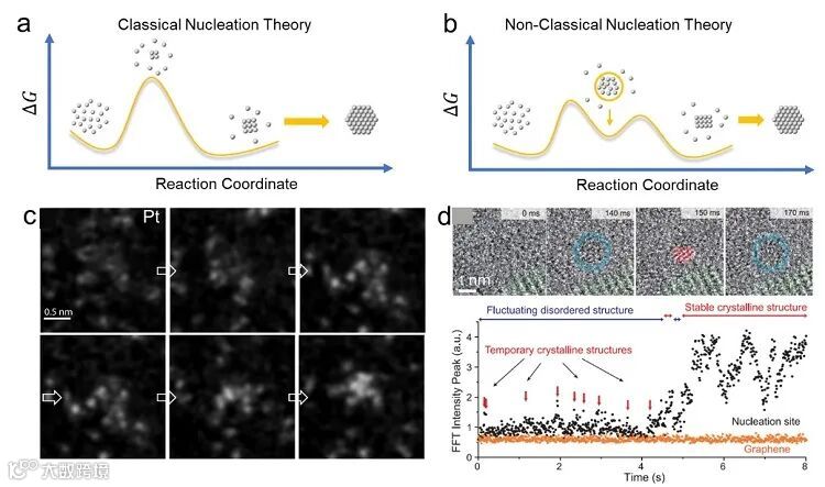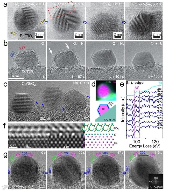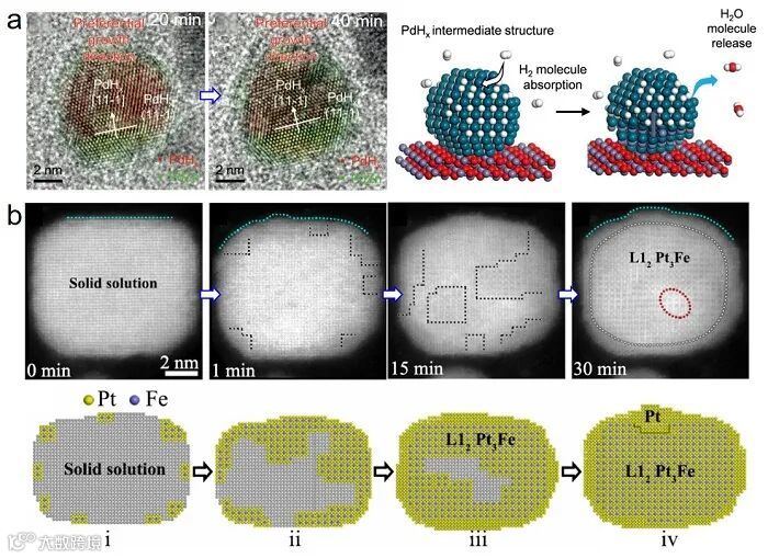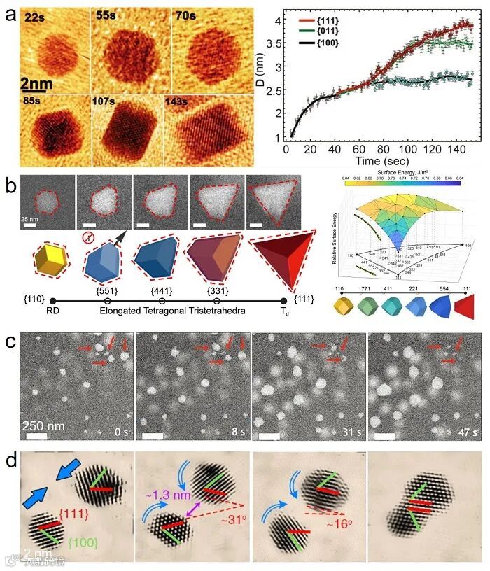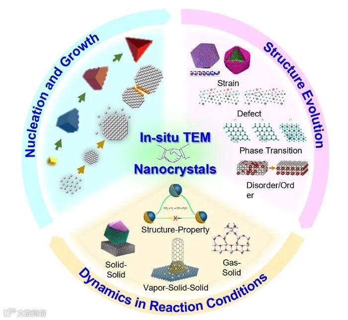 材料的可控制备是新材料研究的基础,在一定特征尺度深刻理解纳米结构的生长过程是实现材料可控制备的基石。通常人们利用透射电子显微学和其他原子尺度表征方法配合纳米材料制备方法来推断生长机理,这种表征一般是在生长完成以后进行的,没有实时反映出纳米结构的演化过程,难以提供优化制备条件所必需的综合信息。近年来发展的原位和环境透射电镜,可在电镜中模拟纳米晶体生长的物理化学过程,在原子尺度原位观察晶体生长过程中的动态原子迁移、原子结构、表面结构、界面原子构型和电子态等的演变过程,为研究晶体的生长机制、结构影响性能的微观机理等提供了直接的实验证据。利用原位电镜实时研究晶体生长已成为材料学研究的重要前沿手段之一,并已经取得了重要研究进展。鉴于此,北京科技大学王荣明教授和南方科技大学杨烽助理教授合作,在国际知名期刊Advanced Materials上发表题为“Atomic-Scale Structure Dynamics of Nanocrystals Revealed by In-Situ and Environmental Transmission Electron Microscopy”的综述文章,总结了原位电子显微术在纳米晶研究中的重要进展,并对未来该领域的研究提出了展望。论文第一作者为赵豪飞、朱玉辰、叶欢宇。 全文主要包括三个部分:纳米晶的成核与生长、结构演化和在反应动力学的原子尺度原位和环境透射电镜研究。在概况总结原位和环境透射电镜在纳米晶的成核理论由经典理论向非经典理论发展中的作用基础上,介绍了在液相和固相条件下纳米晶的经典、非经典成核特征,原位研究了不同条件下纳米晶的生长路径;聚焦单元金属和合金纳米晶,基于应变、缺陷、相变和有序-无序转变等原子尺度原位观察,探究了影响结构演化的物理机制,总结了运用球差校正环境透射电镜研究反应气氛下的固-固和气-固界面演化过程最新进展,关注纳米晶中轻元素(O、C、N、H等)在反应过程的动态行为及其与催化性能之间的关联。最后,讨论了原位和环境透射电镜在纳米晶研究中面临的挑战和对策,展望未来,提出原位和环境透射电镜的发展方向和目标。