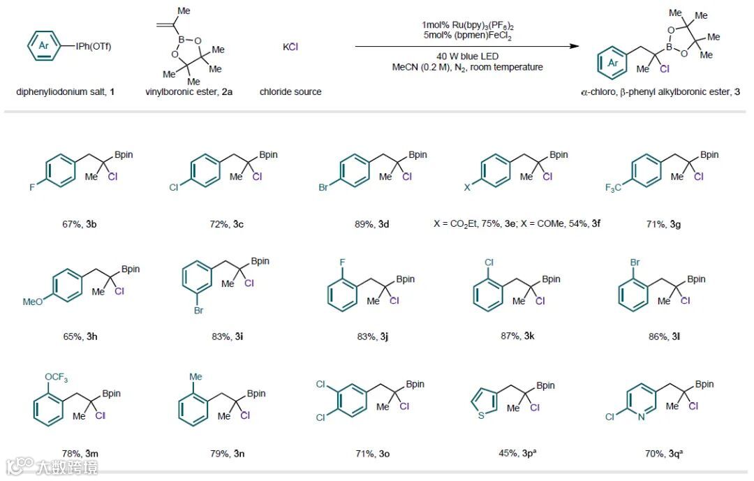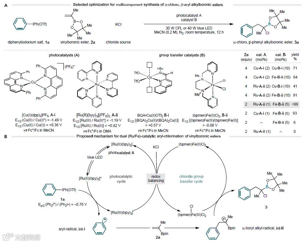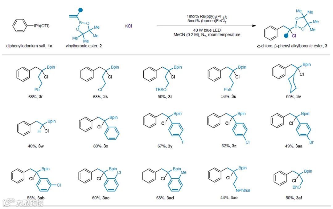 α-氯代烷基硼酸(α-CAB)酯是一类比较稳定的双功能分子。该类分子的碳原子上同时包含具有不同反应性的C–Cl键和C–B键,使得该碳原子可以转化为碳亲核试剂、碳亲电试剂或者碳自由基中间体,进而表现出各自不同的反应性。尽管α-CAB酯具有以上多种用途,但它的复杂衍生物很难通过现有方法制备。基于此,来自英国剑桥大学的Matthew J. Gaunt教授团队近日在Cell Press细胞出版社期刊Chem 上发表了题为“Multicomponent synthesis of α-chloro alkylboronic esters via visible-light-mediated dual catalysis”的最新研究。他们使用一种新颖的可见光介导的双金属协同催化系统,并将二芳基碘鎓盐、乙烯基硼酸酯和简单的金属氯化物转化为稳定的、多用途的α-CAB酯类化合物。