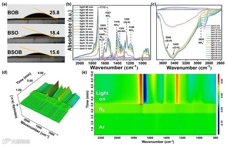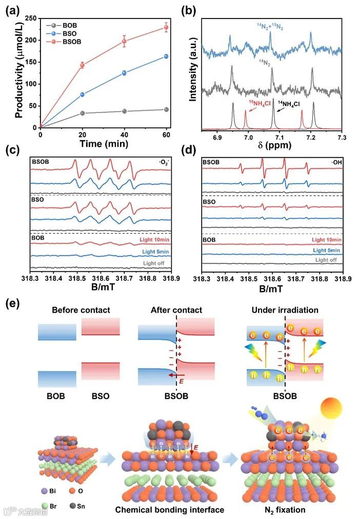 /BiOBr(BSOB)S型异质结。在光照过程中,BOB的导带中的电子迅速与BSO的价带中的空穴重组,富集在BSO的导带中的电子赋予了BSOB强大的还原能力,驱动高效的光催化固氮过程。优化后的BSOB光催化固氮活性显著高于BSO于BOB材料,在纯水中的N