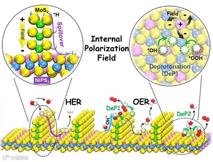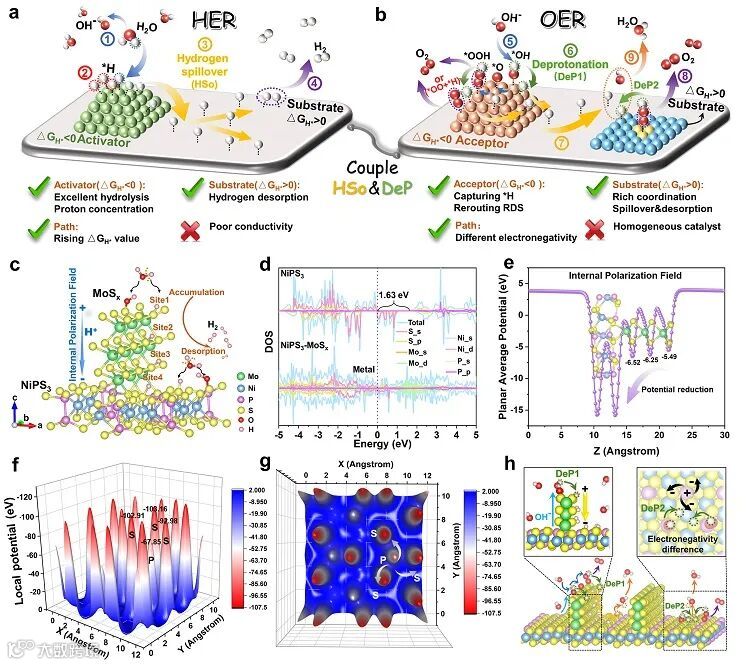 近日,西安交通大学材料学院戴正飞特聘研究员与南京理工大学曾海波教授针对上述问题开展合作研究,剖析了氢溢流和去质子化机制发生的必要条件,揭示了统一HSo和DeP的潜在驱动力是内建极化场。理论分析表明,MoS2/NiPS3异质结构中的HSo路径和双DeP途径使其具有满足HER/OER双功能催化活性的可能。基于此,采用简单经济的策略构建MoS2/NiPS3异质结构,促进MoS2的边缘暴露和NiPS3基面的激活。在碱性条件下,异质结构表现出比纯材料更优的催化活性和周转频率。此外,该催化剂能在1.64 V的低电压下进行全水分解,并具有100 h的良好稳定性和高法拉第效率(~99%)。太阳能辅助水电解装置展示了其用于绿色可持续制氢的前景。进一步的实验和理论研究验证了内建极化场的存在和碱性条件下基于TM体系的合理HSo/DeP反应路径。