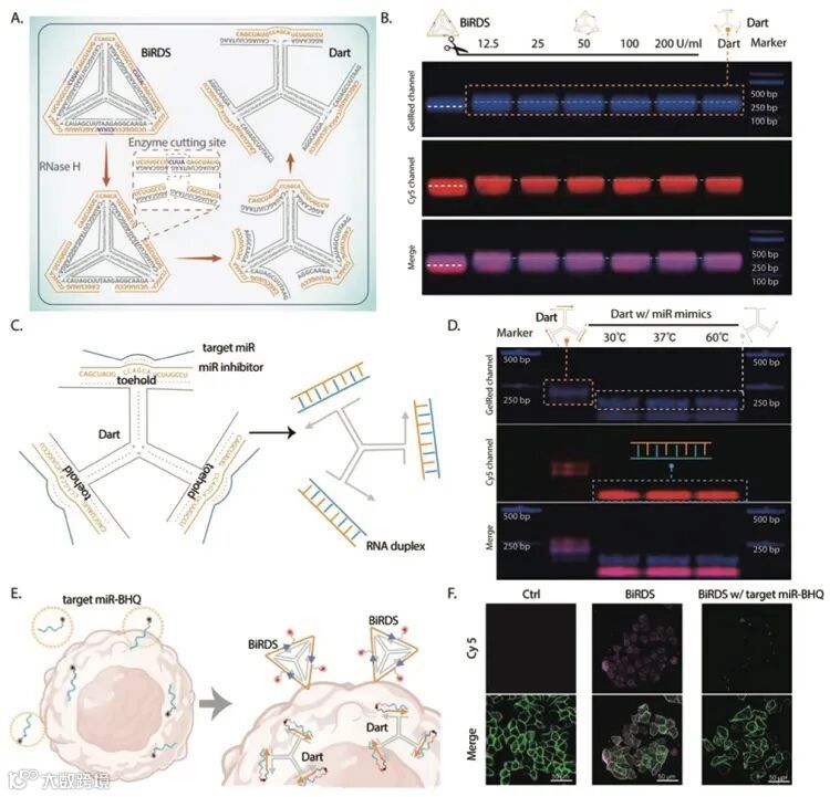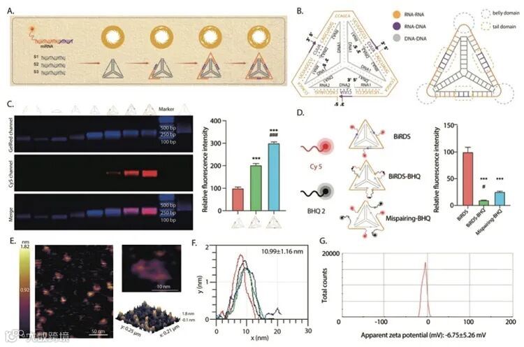 受到中华文化遗产标志“太阳神鸟”的启发,四川大学林云锋教授团队设计了一种由三条相同microRNA(“神鸟”)首尾相接环绕核酸骨架(“太阳”)的基于四面体框架核酸的生物响应性microRNA递送系统(BiRDS)。相较于传统运载系统,BiRDS保持了四面体框架核酸(tFNA)的四面体三维结构表现出了较强的细胞摄取能力,而且该结构的小尺寸特性使其具有很强的经皮渗透能力。BiRDS给予了microRNA充分保护,无论是在高浓度血清或是核酸酶中均表现出出色的稳定性。除此之外,在该结构内部设计了“腹域”和“尾域”两处重要的功能区域,从而实现BiRDS的生物响应性以及充分发挥microRNA的功能。该研究突破了传统使用框架核酸运输microRNA的模式,解决了microRNA治疗的缺点的同时也为其他核酸类似物(LNA、PNA等)的递送提供了一条新思路。相关研究论文发表在Advanced Materials 上。