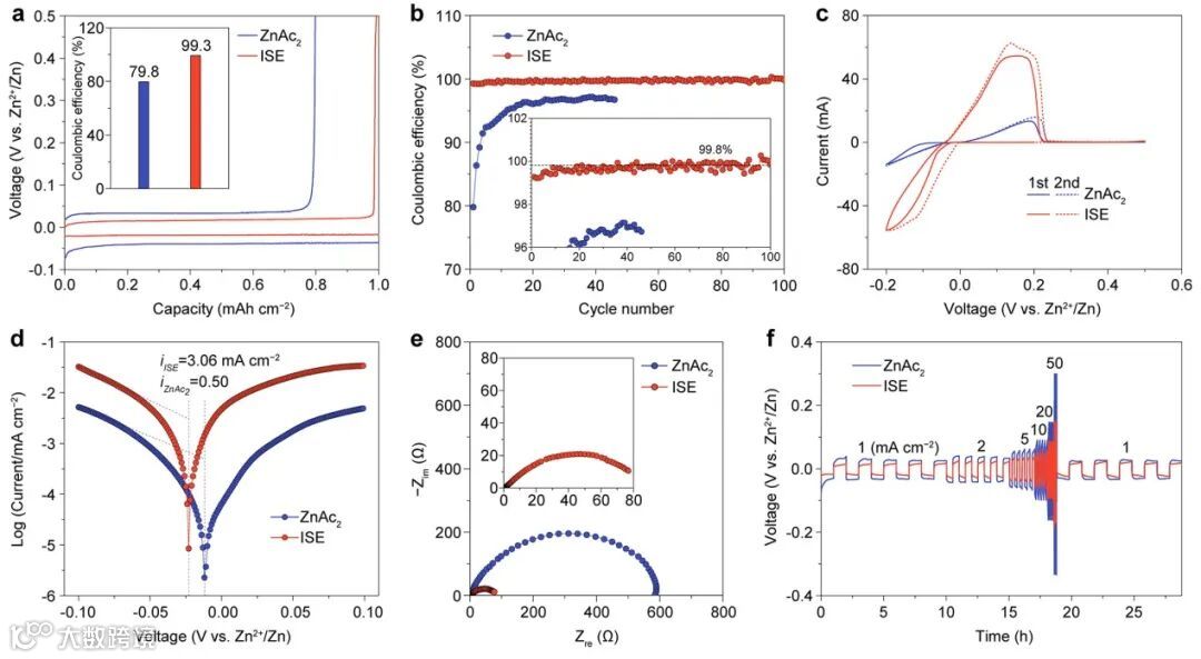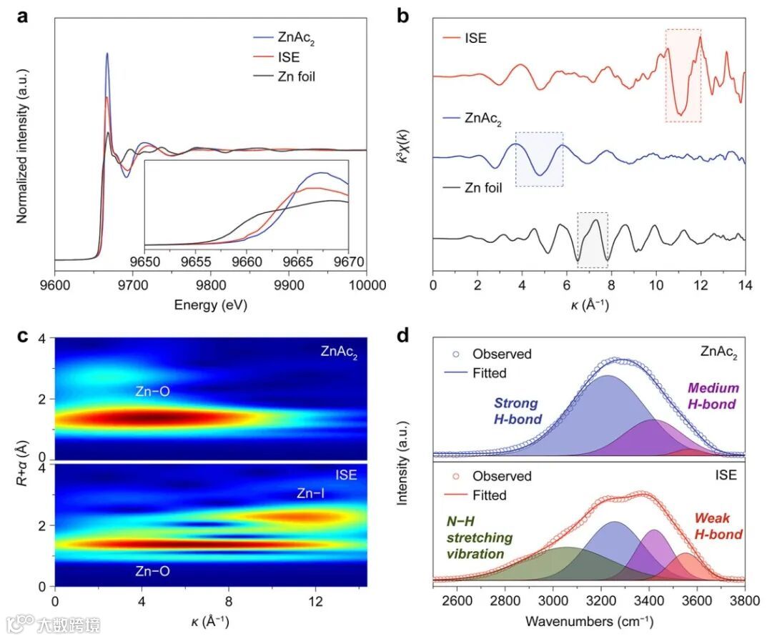 参与溶剂化结构的电解液(ISE),可以有效抑制析氢副反应和锌枝晶生长(图1)。这种溶剂化结构的变化经过实验和计算上的验证(图2),最终使得