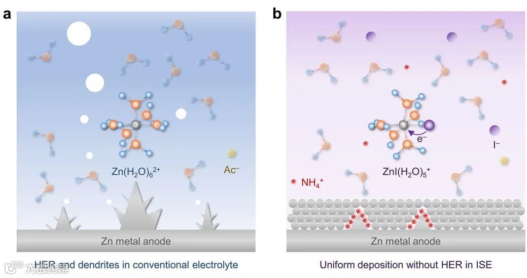 导读:南开大学陈军课题组利用碘离子对锌离子较强的相互作用,将其掺入Zn(H2O)62+中形成ZnI(H2O)5+的溶剂化结构。