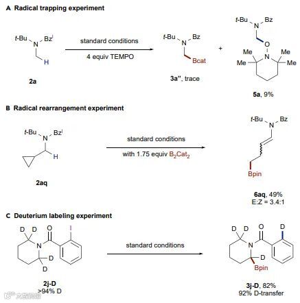 为了进一步探究反应机理,作者进行了一系列实验。具体而言:1)TEMPO参与的自由基捕获实验得到了痕量的硼化产物
