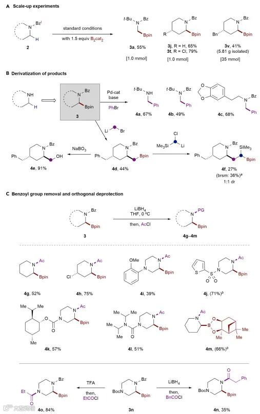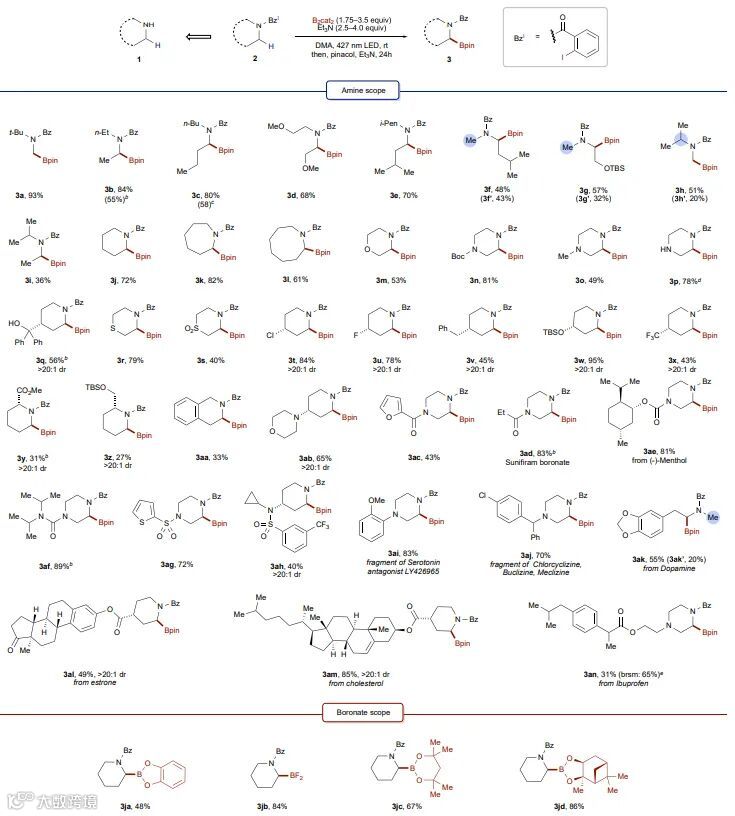 )的后期修饰,进一步凸显出该方案对复杂胺底物进行后期官能团化的可行性。其次,作者还以中等至较好的产率得到其它硼酸酯(