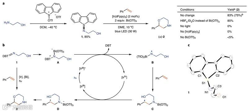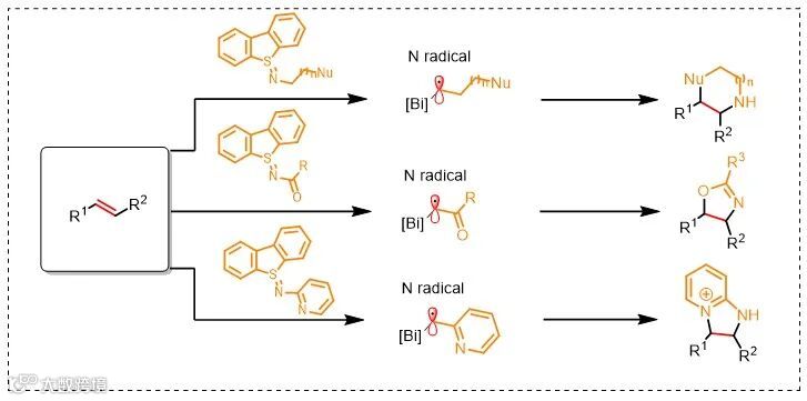 含氮杂环是药物化学中至关重要的砌块之一,据统计,FDA批准的药物分子中一半以上都含有至少一个含氮杂环。目前,构建含氮杂环化合物的重要方法之一是Buchwald-Hartwig反应,可将不同片段通过C-N键偶联来链接。更多样性的方法则是通过分子内的缩合、环化、取代等经典的杂环合成方法为主。另外,分子间的烯烃双官能团化反应是近几十年以来发展出来的新型杂环构建策略,但是受限于烯烃本身的性质,模块化的合成方法往往十分有限。得益于N-H键较高的键能(107 kal/mol,NH3),N中心自由基(nitrogen-centered radical,NCR)在进行分子内氢原子转移(HAT)过程中是一类活泼的反应物种,因此可以作为关键的中间体来构建新的C-N键。另外,NCR也可以作为亲电自由基,与富电子烯烃、芳烃加成形成相应的烷基胺或芳胺。实际上,该策略被广泛应用于烯烃的加氢胺化、氨氧化、氨氟化、碳胺化、氨叠氮化反应等。尽管如此,但是NCR前体所含有的磺酰基等用于增强其亲电能力的保护基也限制了其应用。近日,Tobias Ritter教授课题组利用硫亚胺(由二苯并亚砜与胺制备而成)为双功能N-自由基前体,在光氧化还原催化下实现了硫亚胺与烯烃的分子间环化反应,一步法构建了多种未保护的含氮杂环,如吗啉、哌嗪、二氢噁唑、二氢咪唑衍生物等。相关成果发表在Nature Chemistry 上。