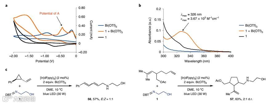 为了进一步探究反应机理,作者进行了一系列实验。硫亚胺1和Bi(OTf)3混合物(1:1)的循环伏安图显示出一个新的电位峰,作者将其归因于1-Bi(OTf)3加合物A,并通过紫外-可见光谱(326 nm处有吸收峰)证实了其存在。另外,作者还在最优条件下进行了自由基钟实验,分别得到开环产物56 和环化产物 57,进一步证实了NCR的存在。在此基础上,作者提出了可能的反应机理:首先,硫亚胺1和Bi(OTf)3形成1-Bi(OTf)3加合物A,A在光催化的作用下产生N中心自由基B。随后,B与烯烃进行加成得到相应的碳自由基C,再被[IrIV]氧化为相应的碳正离子D,最后经分子内亲核进攻得到相应的含氮杂环2。