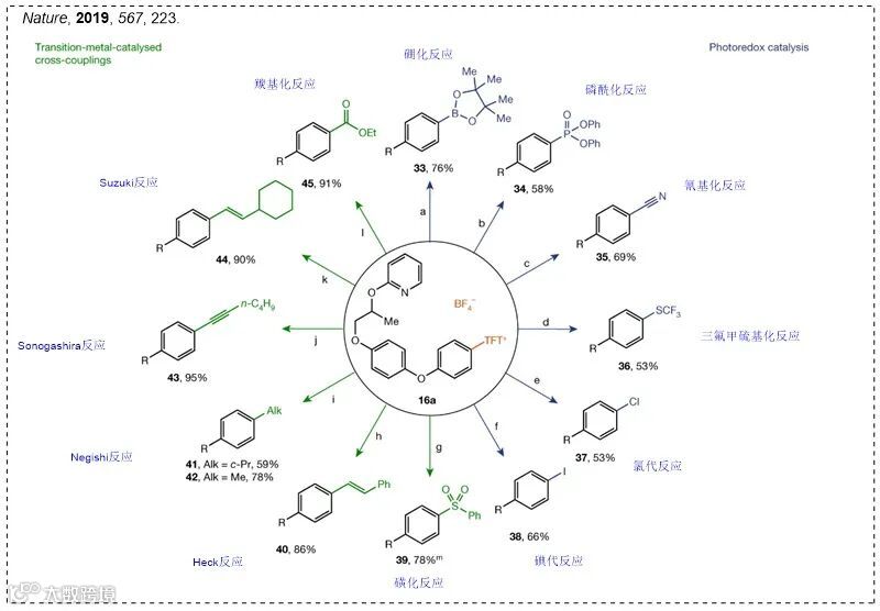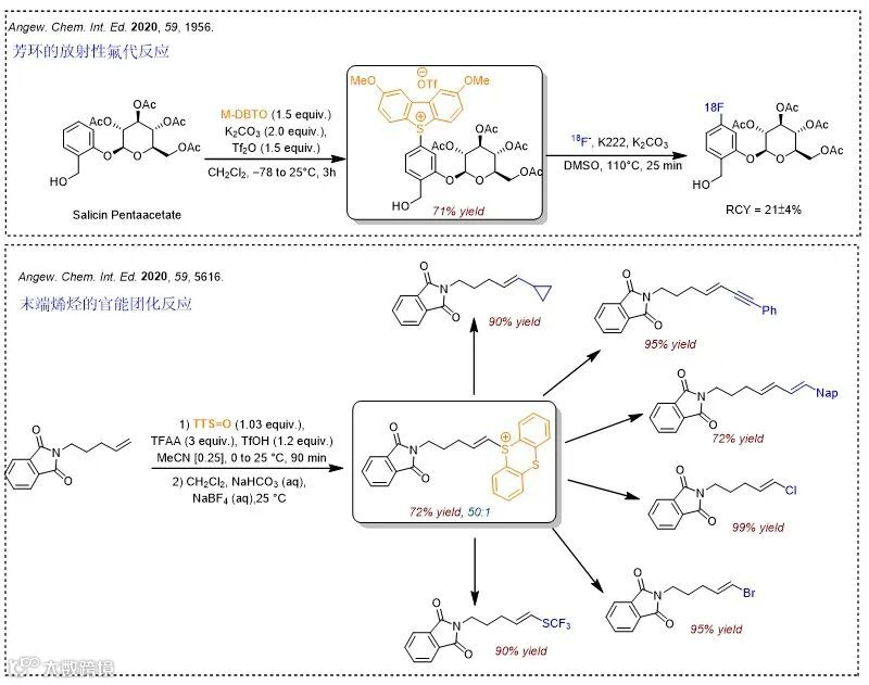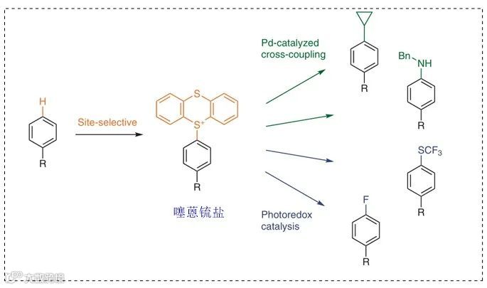 随后,他们基于噻蒽鎓盐产生的稳定噻蒽阳离子自由基,成功地实现了芳基C-H键的选择性官能团化反应(Nature, 2019, 567, 223, 点击阅读详细),并且得到的产物还能进行后续的衍生化,例如:羟基化、硼化、溴化、氯化、烯基化、氟化、烷基化等。下面对基于锍盐的反应做一个简单的介绍: