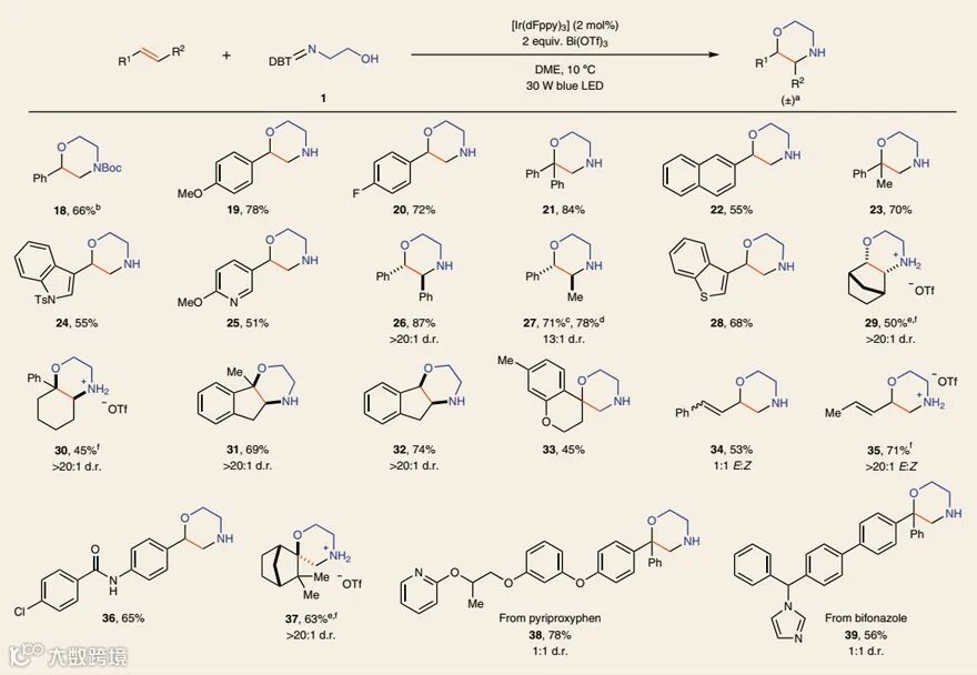首先,作者从市售可得的氨基乙醇和三氟甲磺酸酐活化的二苯并噻吩-S-氧化物出发,一步法合成双功能N-自由基前体——硫亚胺1,再与苯乙烯在光氧化还原催化下进行反应便可得到相应的苯基吗啉2。尽管该反应需要化学计量的二苯并噻吩-S-氧化物,但是在环化后能重复使用。另外,对照实验表明光照和光氧化还原催化剂对该反应至关重要,并且Brønsted酸和Lewis酸均能加速环化反应,这可能是由于酸能与硫亚胺配位,从而有效地促进其与激发态光催化剂之间的单电子转移(SET)。需要指出的是,Brønsted酸往往会不可避免地诱发富电子苯乙烯的聚合反应,而Bi(OTf)3则能最大程度上促进该自由基环化过程。作者一步法合成了多种双功能硫亚胺试剂(3-10、12-17),大多都是固体并且能在室温下稳定存在至少3个月,产物6除外。