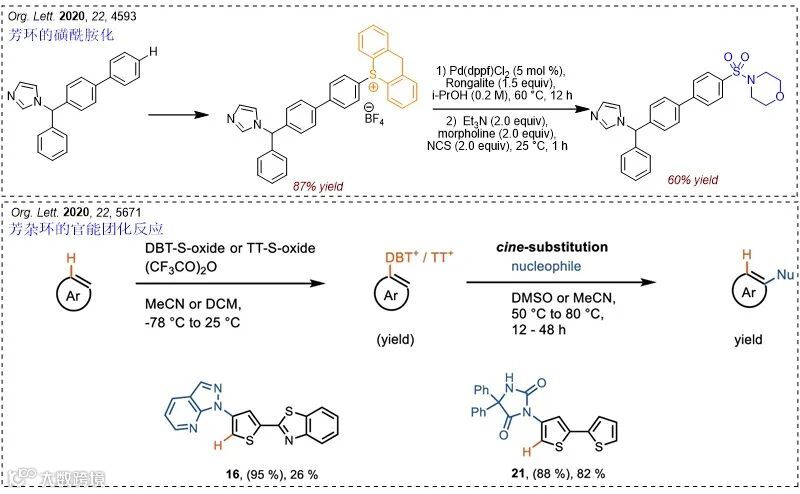 此外,鉴于锍盐自由基阳离子的稳定性以及形成衍生物的选择性、离去活性,更多的取代反应也被开发出来,包括磺酰胺化、噻吩环的官能团化反应等。