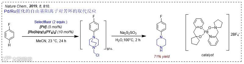 此前的2016年,他们发现高亲电自由基阳离子TEDA2+·能够实现芳环的区域选择性,并发展了Pd/Ru双金属催化的芳环的C-H键官能团化反应(Nat. Chem., 2016, 8, 810, 点击阅读详细)。然而,该反应只能用Selectfluor试剂将可预测位置转化成铵。尽管如此,通过自由基阳离子来实现芳环的选择性官能团化已初现端倪。
