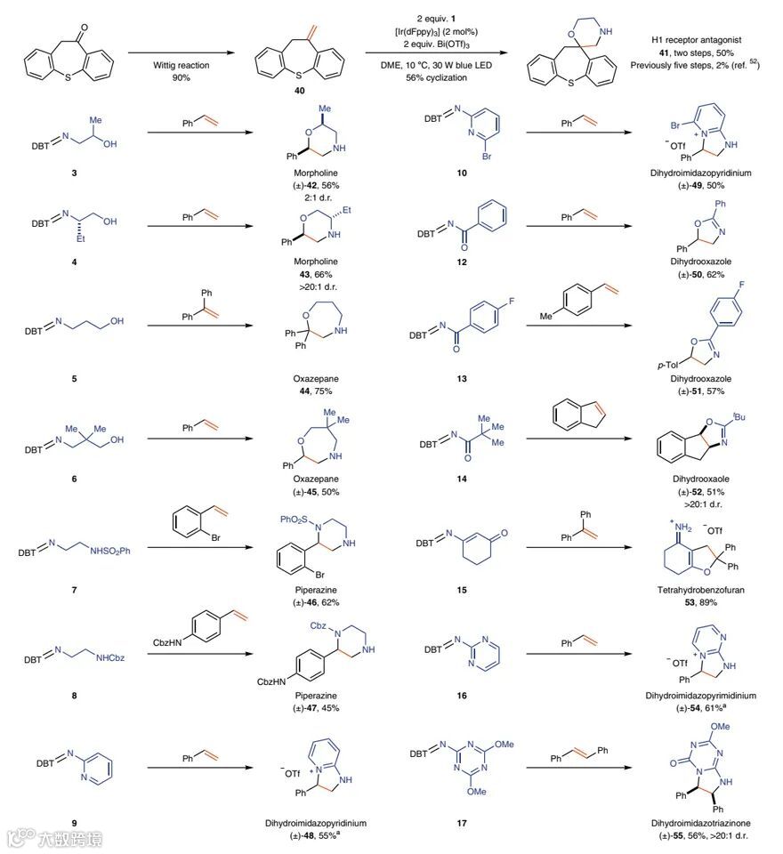 接下来,作者对该反应的底物范围进行了考察。苯乙烯及其衍生物(18-23、36)、杂芳基取代的烯烃(24、25、28)、1,2-二取代烯烃(26、27、29、32)、1,1-二取代烯烃(21、23、30、31、33、37)甚至环状烯烃(29-32)均能兼容该反应,以中等至较好的收率得到相应的吗啉产物,包括双环/三环吗啉、螺环吗啉。此外,对硫亚胺上的取代基稍加修改后,就能合成多种其它类型的杂环化合物,例如二取代吗啉(42、43)、七元氮氧杂环(44、45)、哌嗪(46、47)、二氢噁唑(50-52)、二氢咪唑衍生物(48、49、54、55)。有趣的是,当使用硫亚胺15进行反应时,仅以89%的收率得到四氢苯并呋喃53而非N-杂环,这可能是由于生成的烯胺 NCR 转化为更稳定的碳中心自由基,然后参与1,1-二苯乙烯的环化。最后,作者还以两步、50%的总收率合成了H1受体拮抗剂41,而先前的方法则需要5步并且收率仅为2%,这进一步凸显出该方法的合成价值。