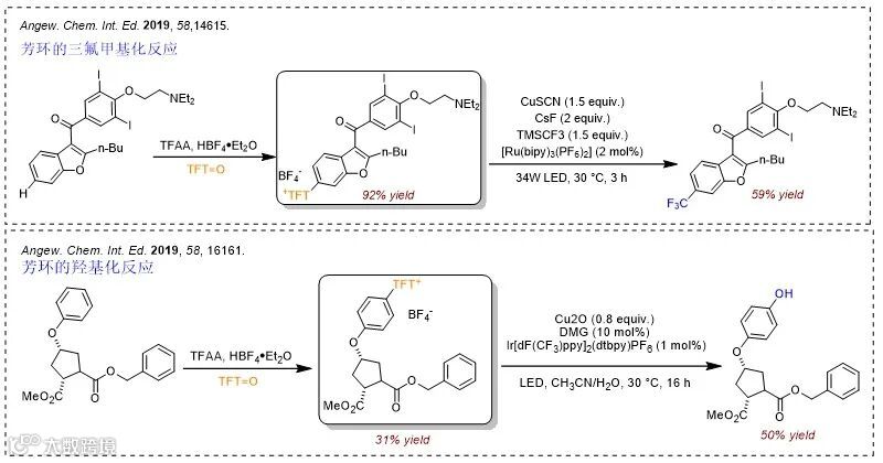 对药物分子进行氟代修饰,可以改善药物分子的代谢稳定性和血脑屏障通透性。近年来,德国马克斯•普朗克煤炭研究所的Tobias Ritter教授课题组致力于发展芳环的氟化反应,因此直接的碳氢键官能团化反应就成为一种极具优势的策略。噻蒽及其衍生物能够形成稳定的自由基,从而与芳环发生自由基加成反应。然而,常见的自由基对芳环的加成反应往往选择性不高,因此寻找电荷亲和度高(即对富电子位点选择性高)的自由基阳离子是较好的解决策略,其中噻蒽(或二苯并噻吩)的三氟甲磺酸锍盐可与富电子芳环发生反应。另外,根据芳环电性的差异性,所使用的噻蒽(或二苯并噻吩)也有所不同。