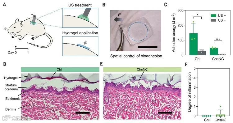 当然,该技术还具有生物安全性和有效性。啮齿动物皮肤对高强度超声波更加敏感,通过对其进行实验,几分钟内就可以在特定位置形成超强的生物粘附,且超声并未对组织造成明显的损伤或发炎。
