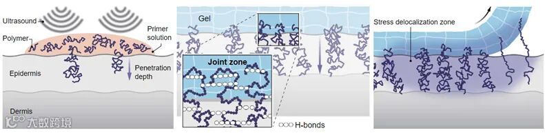 利用超声空化作用将“锚定剂”分子推入表层生物组织以克服屏障效应,随后再施以水凝胶并发生相互作用