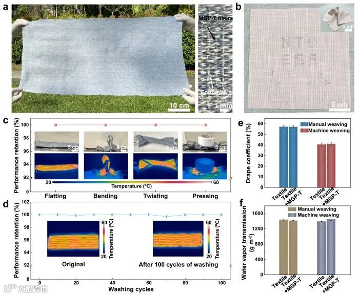 图2. 基于高密实MXene纤维纳米复合材料编织织物展示及织物性能