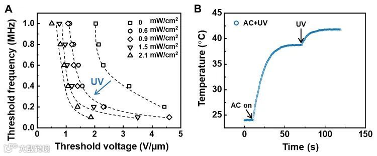 图2. 紫外光门控液体分泌效应。(A)不同紫外光强度下液体分泌的阈值电压以及阈值频率的变化;(B)紫外光以及电刺激下聚合物薄膜的温度随时间的变化。