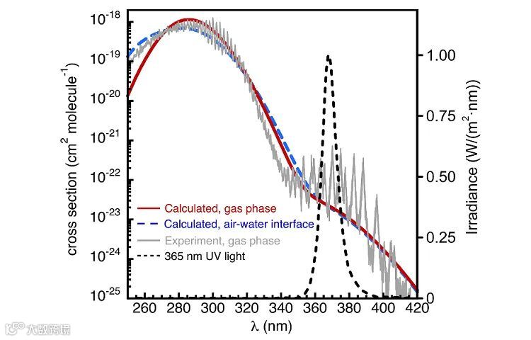 图3. 二氧化硫自旋允许和自旋禁阻的吸收光谱及实验所用的365 nm紫外光谱