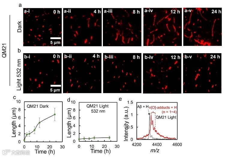 。(d)加入QM21后用激光照射(523nm)从0-24小时的 Aβ蛋白的相应长度。(e)加入QM21激光照射后用MALDI-TOF-MS分析Aβ蛋白的分子